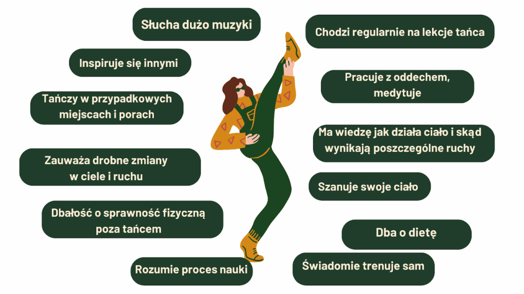 Na powyższej grafice zawarłam najważniejsze z mojej perspektywy elementy tożsamości tancerza, ale na pewno w trakcie czytania tekstu mogą Ci przyjść do głowy jeszcze inne przykłady. Niektóre z nich są kluczowe, inne mniej, ale w całej skali, wszystkie na siebie wpływają i wzmacniają naszą taneczną osobowość.